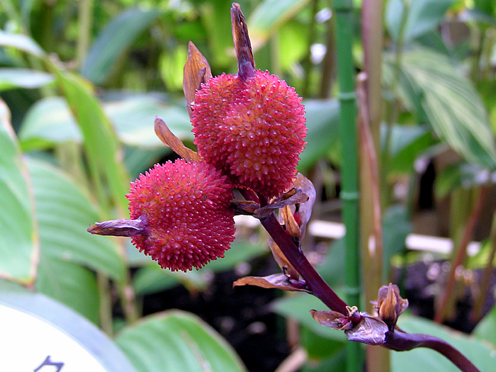 | 形態 | 太い根茎から茎を直立させる。葉は先が尖った長卵形~長楕円形で、光沢があり、基部は茎を抱く。7月中旬~10月上旬の長期間、熱帯では周年、茎頂に総状花序を作り、花を咲かせる。花色は赤、橙、黄など。花弁のように見えるのは、花弁化した雄しべで、本当の花弁は小さく目立たない。花後、表面に柔らかい棘のある球形の蒴果ができ、最初は緑色で次第に赤くなり、黒褐色に熟す。 |