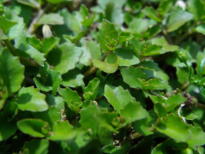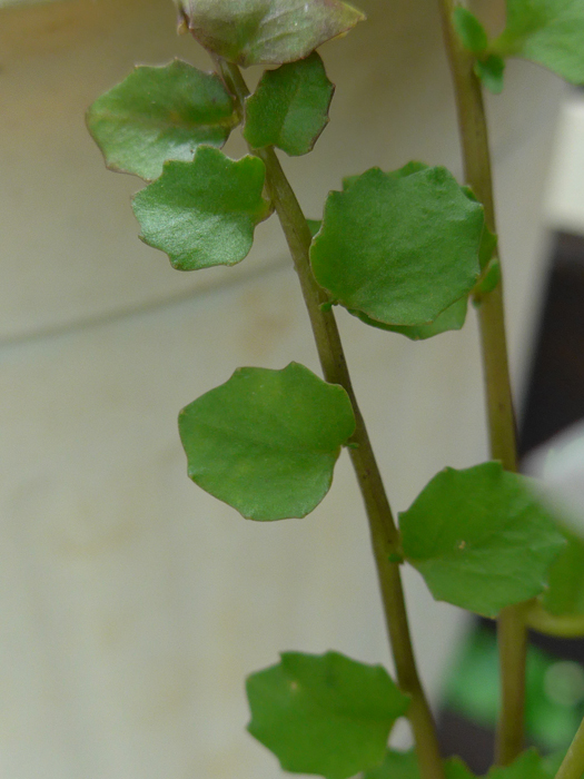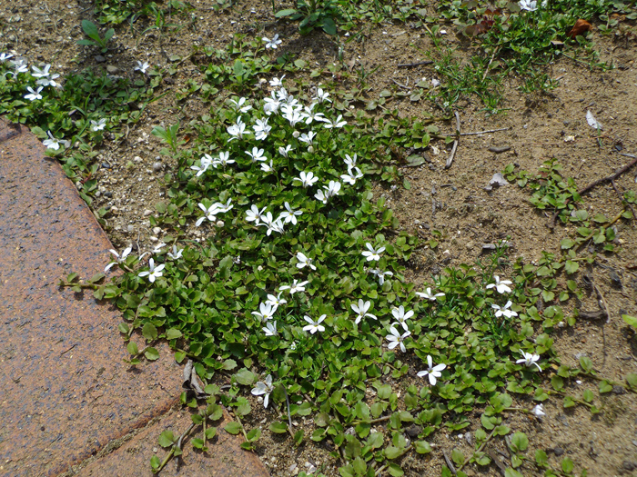 | 形態 | 匍匐枝を伸ばして節から根を出し、這うようにカーペット状に一面に広がる。葉は卵形で、浅くて荒い鋸歯があり、葉柄は無く、互生する。真夏を除く5〜9月頃、葉腋から花柄を伸ばし、先端に白〜薄紫色の花を咲かせる。花は花冠の先端が5つに裂けて平開するが、放射相称ではなく、左右相称の形になる。果実は惰円球形の液果で、紫赤色に熟す。 |