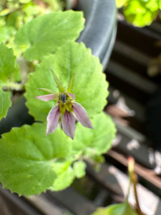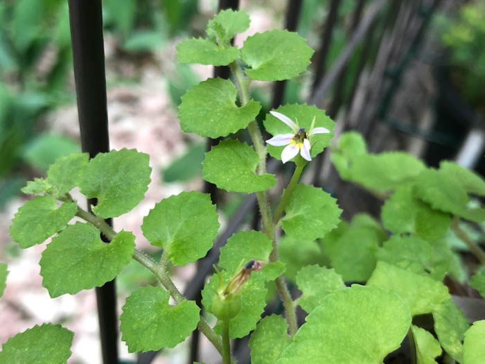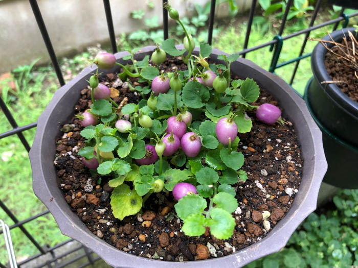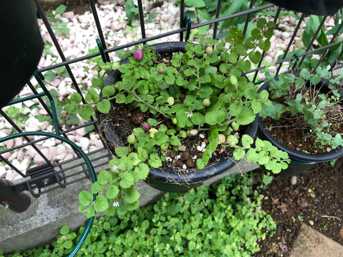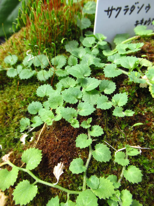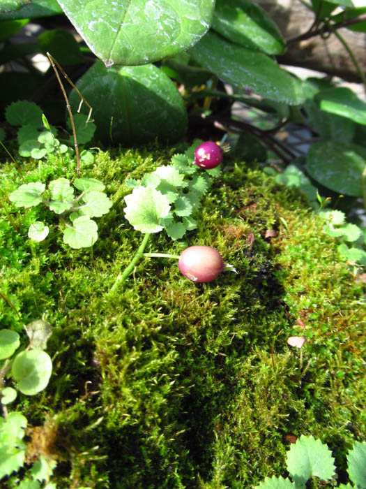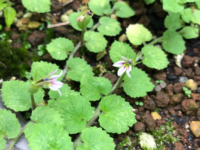 | 形態 | 匍匐枝を伸ばして節から根を出し、這うように広がる。葉は円形~腎臓形~卵形で、荒い鋸歯があり、互生する。5〜7月頃、葉腋から花柄を伸ばし、先端に薄赤紫色の花を咲かせる。花は花冠の先端が5つに裂けて平開するが、放射相称ではなく、左右相称の形になる。果実は惰円球形の液果で、紫赤色に熟す。 |