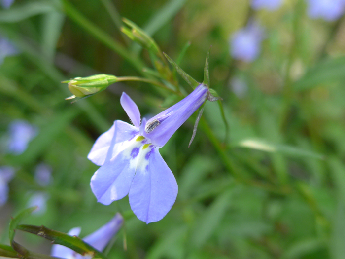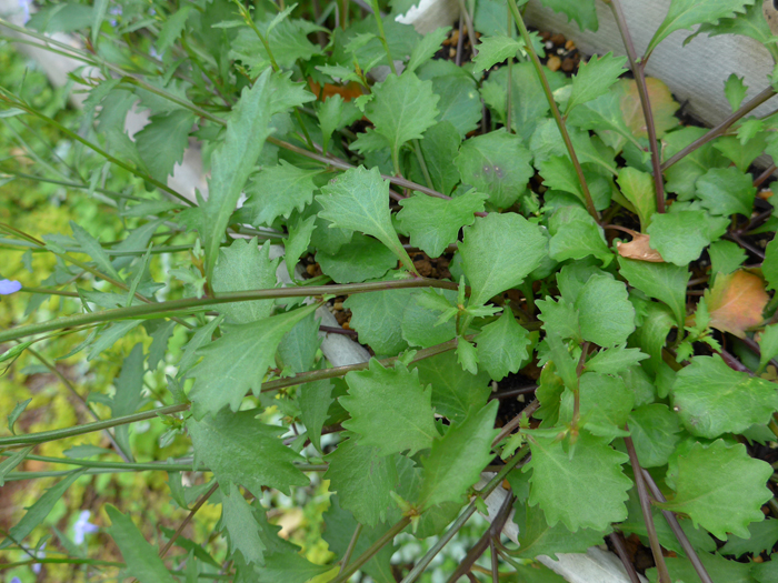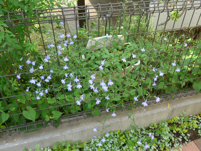 | 形態 | 株元からよく分枝し、ふんわりと広がる。葉は倒卵形で、鋸歯があり、互生する。4~12月頃、長めの花柄の先に薄紫色で中心部が白い花をまばらに咲かせる。花は唇形花で、上側に小さい2裂片、下側に大きい3裂片がある。 |