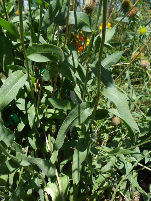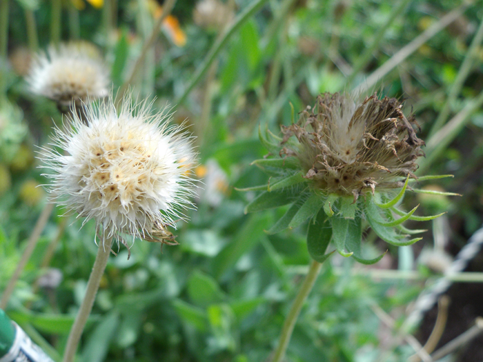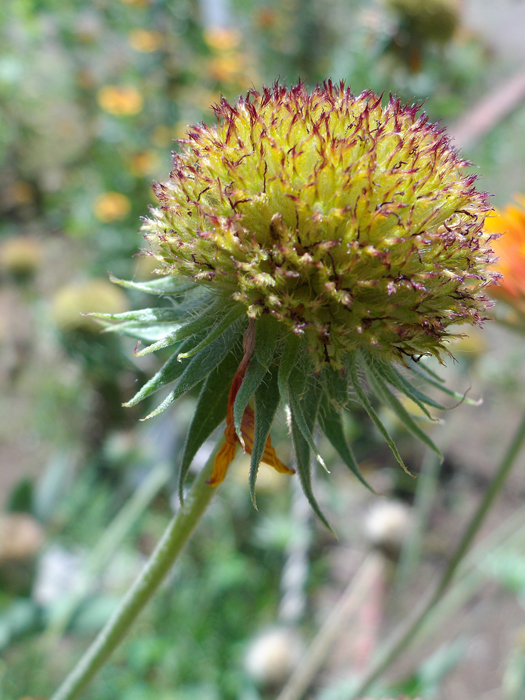 | 形態 | 茎は直立し、やや分枝する。葉は全体に粗い毛があり、下の方は深く切れ込みが入ったりゆるやかな鋸歯があり、上の方は全縁でへら形になり、互生する。6~10月頃、茎頂に頭状花をつける。筒状花は毛羽立った感じのえんじ色、周囲の舌状花は先の方が黄色く、基部が赤橙色。舌状花は先が3~5裂する。花後、舌状花が枯れ落ちると、筒状花の集合部分はくすんだ黄緑色の毛羽立った球形になる。果実は痩果。 |