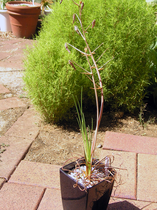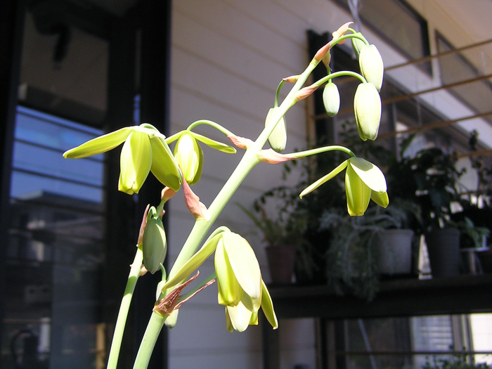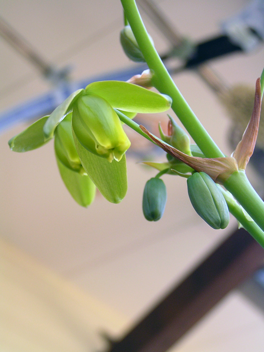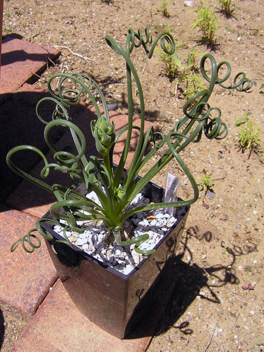 | 形態 | 葉は線形で先端がらせん状にカールし、球根から叢生する。葉には腺毛がある。4~5月頃花茎を伸ばし、花を10個ほど下向きに咲かせる。花色は薄緑がかった乳白色で、外側の花被片3枚は開き、内側の花被片3枚がすぼまっている。花にはバニラのような芳香がある。初夏になると上部が枯れて休眠する。 |