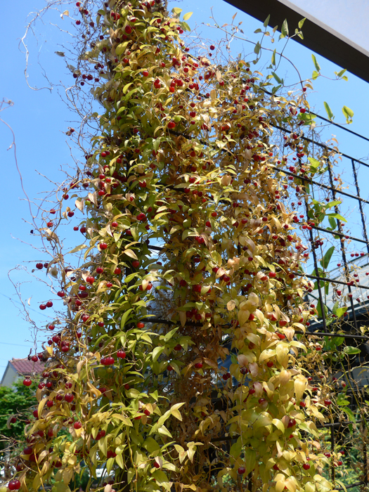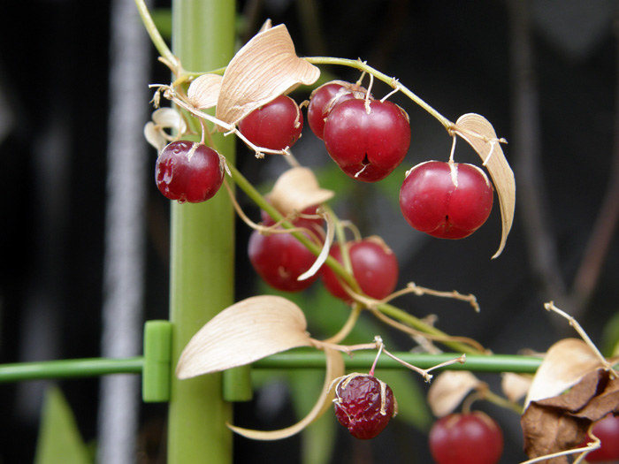 | 形態 | 夏に株元から軟弱な茎が次々と伸び、他物に巻きつきながら成長する。茎に棘は無い。葉のように見えるのは葉状枝(仮葉)という枝で、広披針形。3~4月頃、芳香のある淡緑色の6弁花を多数咲かせる。果実は3つに割れ目が入った扁球形の液果で、6月頃、果実がオレンジ~赤褐色に熟す。実が熟す頃に地上部が枯れる。 |
