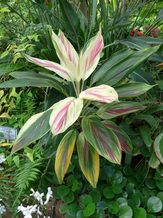 | 特徴 | 葉は、濃緑地に明るいサーモンピンクの縦筋が入る。新葉はほぼ全面が明るいサーモンピンクになる。 |