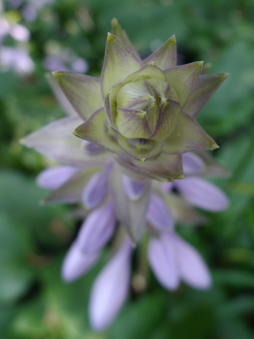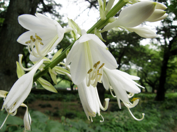 | 形態 | 先が尖った卵状楕円形の葉が根生する。葉は緑色で、縦に走る脈が目立つ。6~8月頃、花茎を立ち上げて総状花序を作り、下から順に1日花をやや下向きに咲かせる。花は漏斗状筒形で、色は白~淡紫色。花の基部に白っぽい苞がつく。 |
