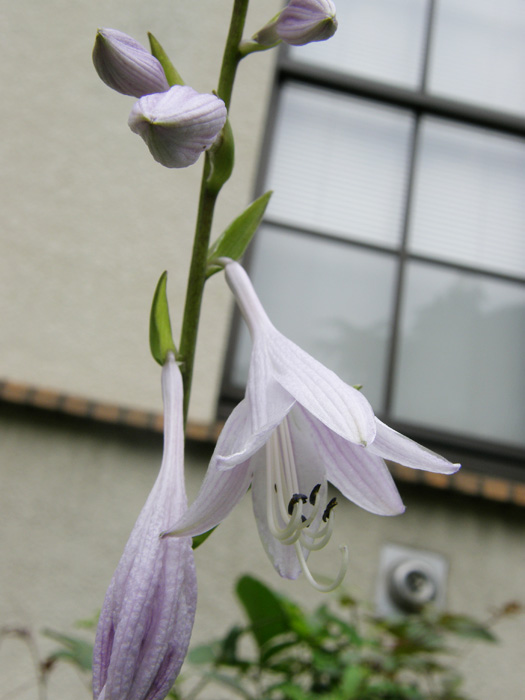 | 形態 | 長楕円形~広卵形の葉が根生する。葉は緑色に白い筋状の斑が入り、縁はウェーブがかかる。6~7月頃、花茎を立ち上げて総状花序を作り、下から順に1日花をやや下向きに咲かせる。花は淡紫色で、漏斗状筒形。花の基部に苞がつく。 |