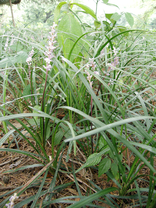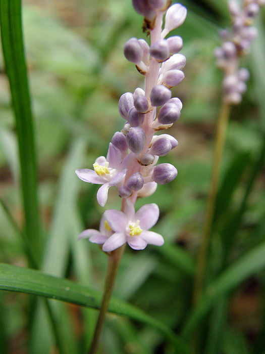 | 類似 | 「ヤブラン」に似ているが、全体に小振りで葉の幅が狭い。花色も薄くくすんだ色。走出枝(匐枝)を伸ばして四方八方に広がり、ぱらぱらとまばらでまとまらない。 |