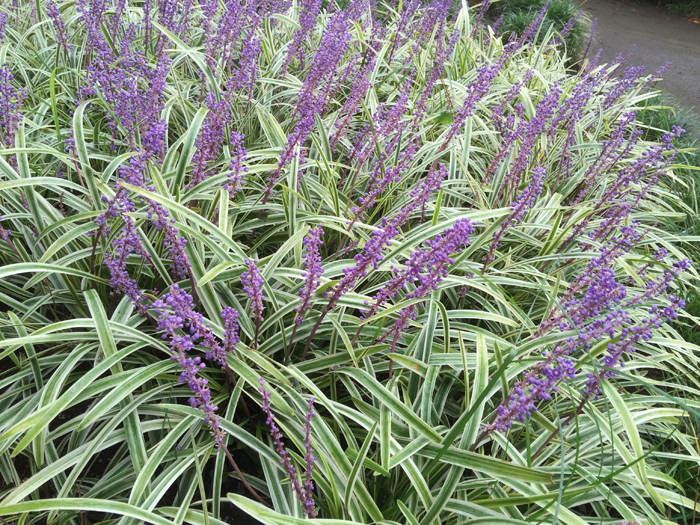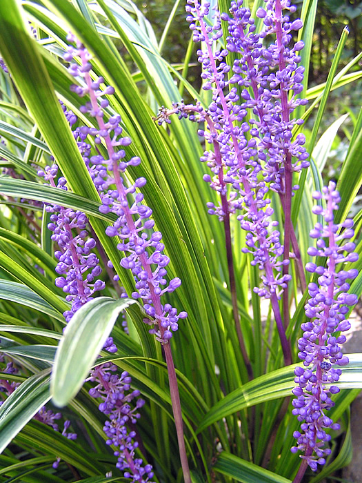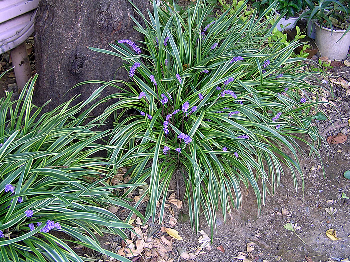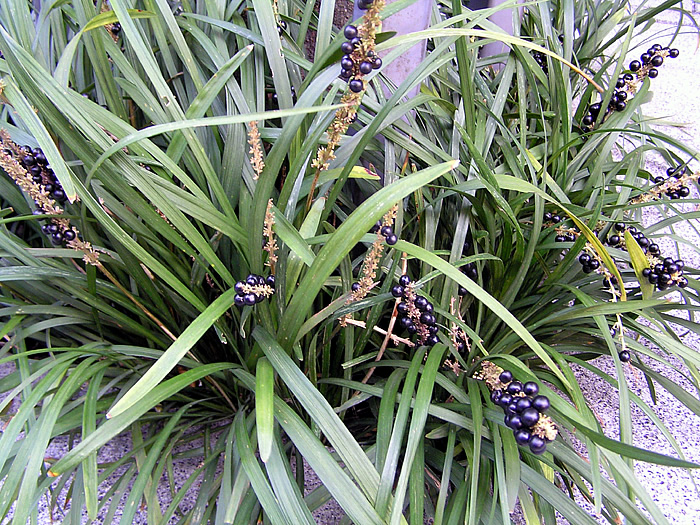 | 形態 | 根茎は太く短く堅い木質で、多数のひげ根と肥大した小塊がある。葉は平たく細長い線状で、根元から多数が叢生し、株立ちになる。8月下旬~10月に花茎を出し、紫色の小花多数を穂状につける。花は、昼間開き、夜間は閉じる。果実は痩果で果皮は薄くすぐ脱落する。種子は秋に光沢のある黒紫色に熟す。 |
