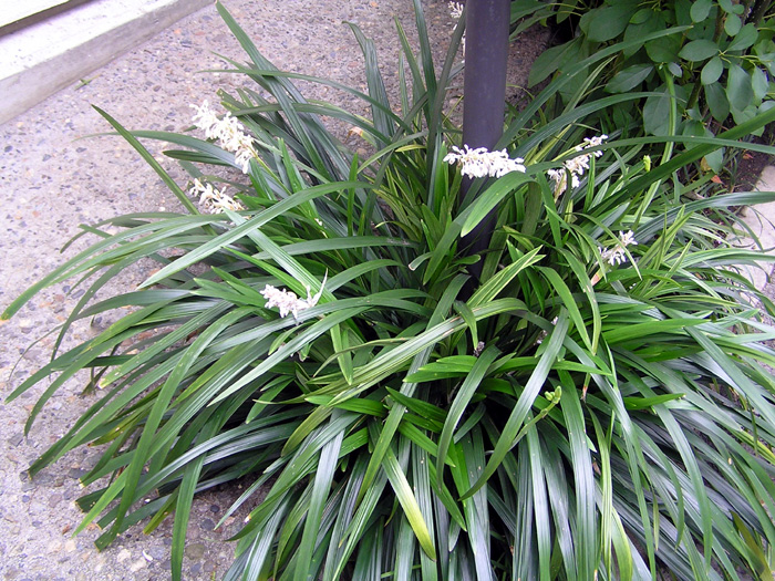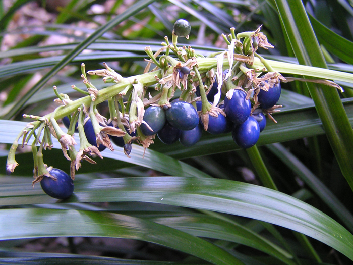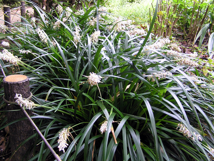 | 形態 | 濃緑色で細長く硬い葉が根生し、半球形となる。7~9月頃、花茎を出して総状花序を作り、白色〜淡紫色の小花を多数下向きに咲かせる。花茎の断面は扁平で、茎の太さとほぼ同じ幅の翼がある。果実は楕円形の痩果で果皮は薄くすぐ脱落する。種子は晩秋に光沢のある青色に熟す。 |
