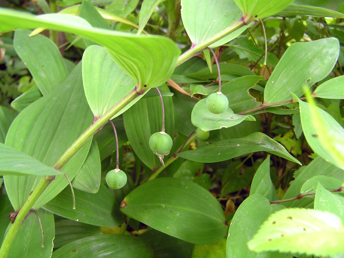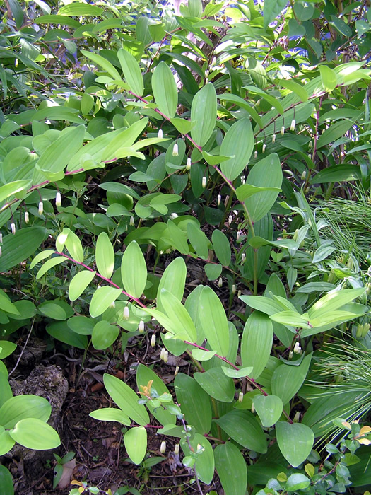 | 形態 | ところどころに節がある根茎を、横に伸ばして広がる。4~5月頃、地下茎の先から弓なりの茎を出す。茎の中部より上には6つの稜がある。葉は両端の尖った長楕円形で、互生する。葉腋から、縁が薄緑の白いベル形の花を1~3個ずつ垂れ下げて咲かせる。花は葉に巻き込まれる形でついており、葉が開くと同時にこぼれ咲く。果実は小さな球形で、熟すと黒紫色になる。 |