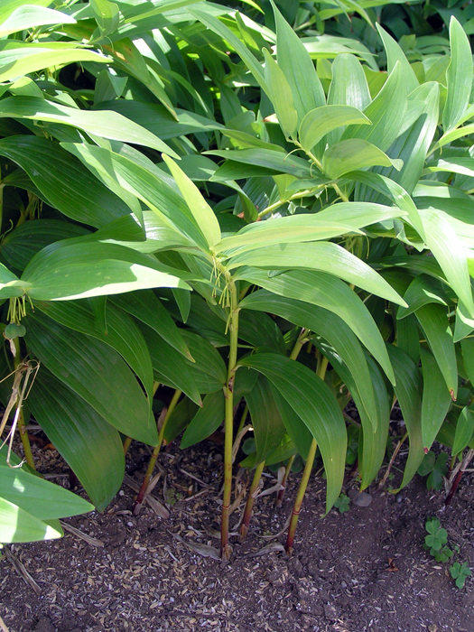 | 形態 | ところどころに節がある根茎を、横に伸ばして広がる。4~5月頃、地下茎の先から弓なりの茎を出す。茎の断面は丸い。葉は両端の尖った長楕円形で、互生する。葉腋から、縁が薄緑の白いベル形の花を3~8個ずつ垂れ下げて咲かせる。果実は小さな球形で、熟すと黒紫色になる。 |