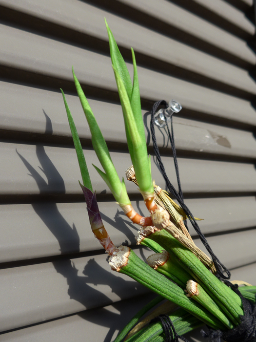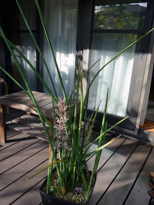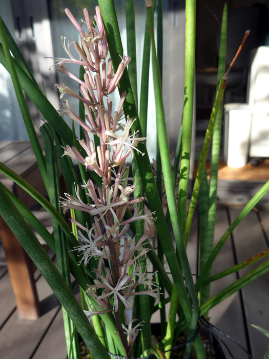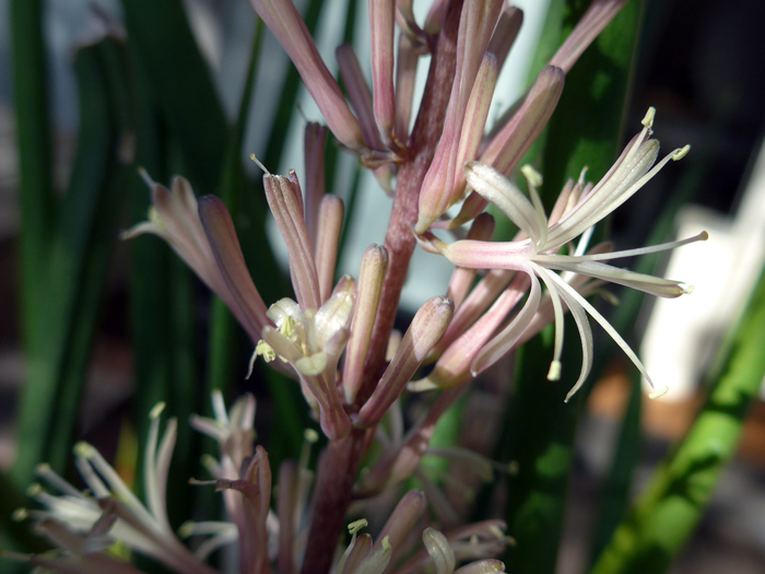 | 形態 | 茎は地下で横に這い、地際から先の尖った円筒形で棒状の葉が叢生する。葉は緑色で、ぼんやりした白っぽい雲状の横縞模様が入り、縦に線状の窪みが入る。基部には紫褐色の地際から花茎を伸ばし、薄い臙脂色で筒状の花を多数穂状に咲かせる。 |