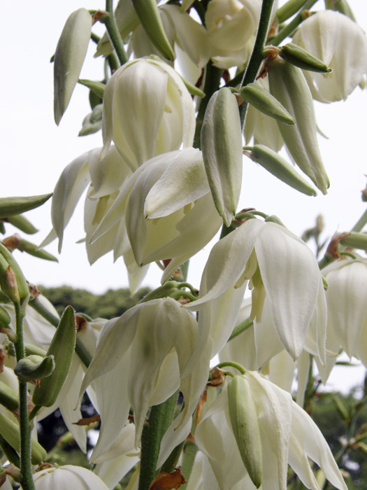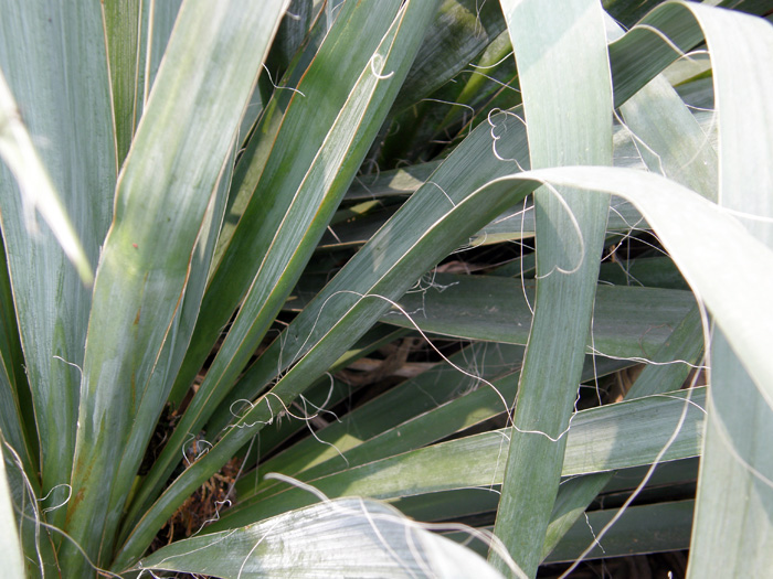 | 形態 | 茎は伸びず、ほぼ地際から葉が放射状に叢生する。葉は剣状で、先端は鋭く尖り、灰緑色の厚い革質で、縁の繊維がほぐれて糸状になる。葉は先がやや垂れ下がる。6〜7月頃、花茎を伸ばして円錐花序を作り、釣鐘状の白い花を下向きに咲かせる。花は6弁で芳香がある。 |