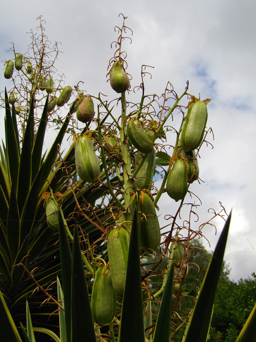 | 形態 | 幹は直立し、基部から少し分枝する。樹高が高くなると倒れる。葉は剣状で、先端は鋭く針状に尖り、灰緑色の厚い革質で、放射状に互生する。7月頃、花茎を伸ばして円錐花序を作り、釣鐘状の白い花を下向きに咲かせる。果実は大きな楕円球形の液状果で、冬には黒く熟す。 |