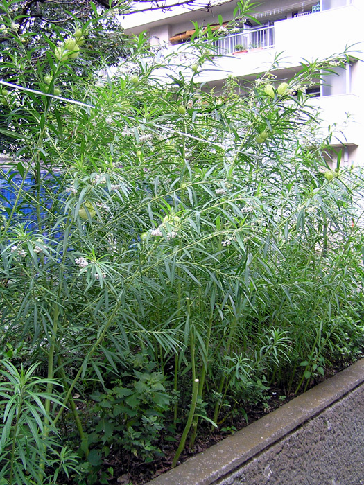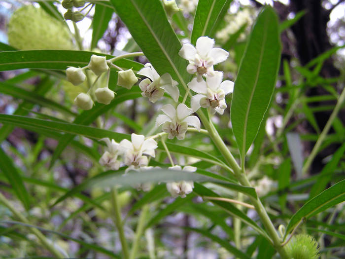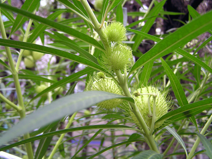 | 形態 | 茎は直立し、やや分枝する。葉は披針形〜倒披針形で、対生する。茎や葉は傷つけると乳液を出す。8~11月に葉脇から長い花柄を出し、5裂する乳白色の花冠と淡いあずき色の副花冠を持った花を6~10個下向きにつける。果実は卵形の袋果で、薄黄緑色で1㎝ほどの柔らかい棘に覆われる。熟すと紫褐色がかり、裂けて中から綿毛をつけた種子が出る。 |