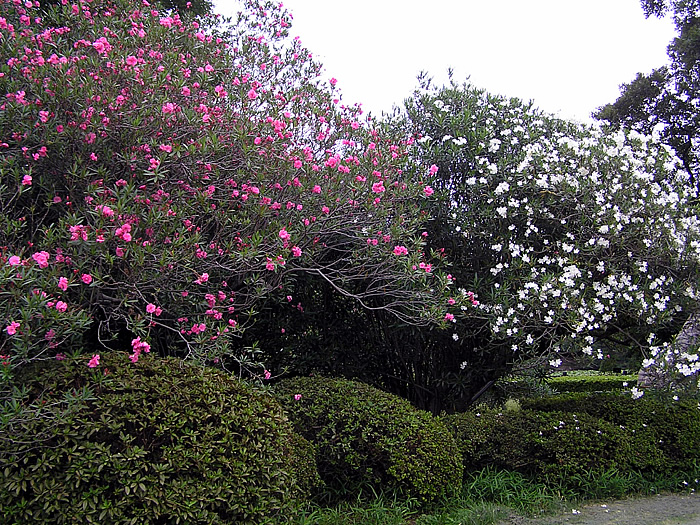 | 品種 | 日本で昔から普及している桃色八重のものは変種の「N. oleander var. indicum」で、花に芳香がある。基本種は「セイヨウキョウチクトウ」といい、白色や濃赤色、中間色などの多彩な花を付け、花には芳香がない。 |