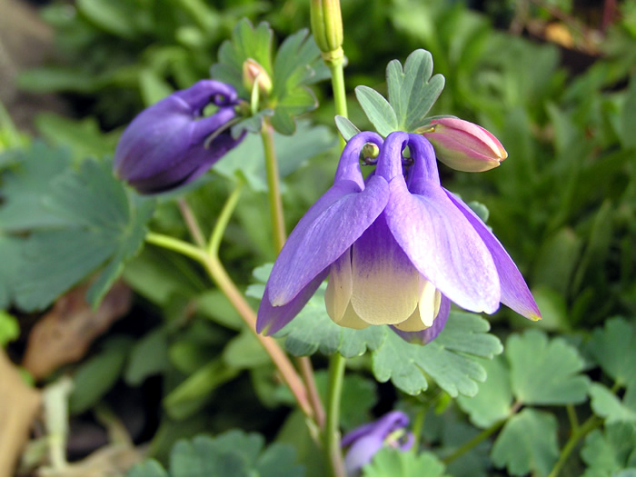 | 形態 | 根は太く、まっすぐに下に伸びる。根生葉は白緑色で、二回三出複葉で、小葉は扇形で2、3裂する。4~6月頃、薄青紫色の花を数個、下向きに咲かせる。花弁のように見えるのは萼片で、ややすぼまりぎみに開く。花弁は中央にまとまり、萼片の間から後ろに短い5本の距が突き出して内側に丸まる。花弁先端部は白い。果実は袋果で、尖った筒が5本集まり、黒い種子が入る。 |