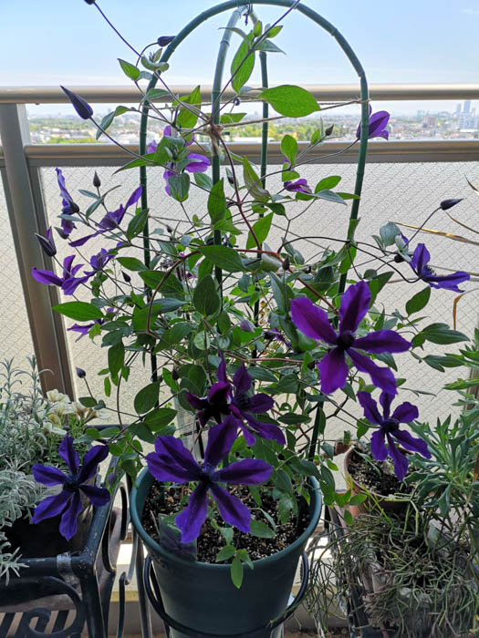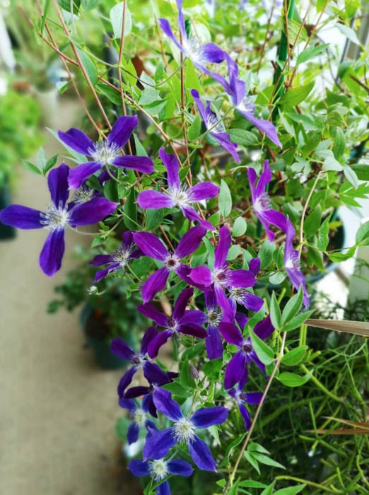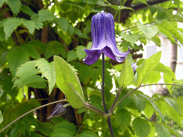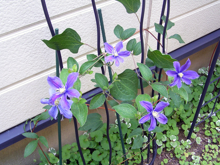 | 形態 | 葉は3出複葉。羽状複葉のものもある。花期は春〜夏。新枝咲き。中輪のベル形や半釣鐘形で、下向きに咲くものが多い。平開して横向き〜上向きに咲く品種もある。蕾は下向き、または横向き〜上向き。花色は、濃紫、臙脂、薄紫、紫、ピンク、白など。 |