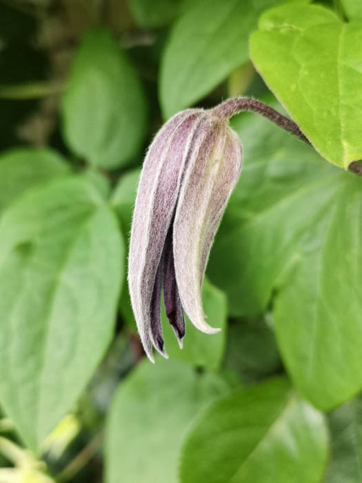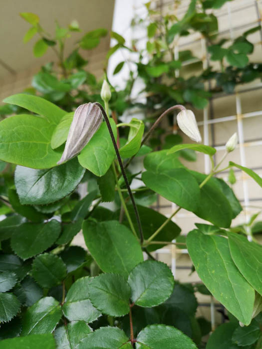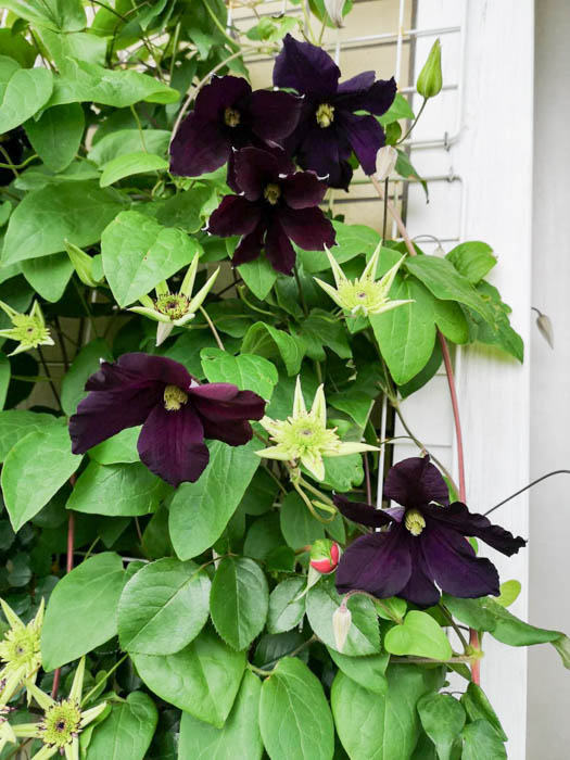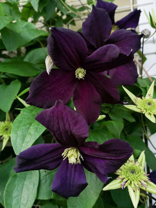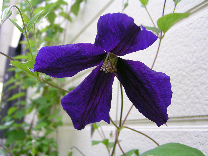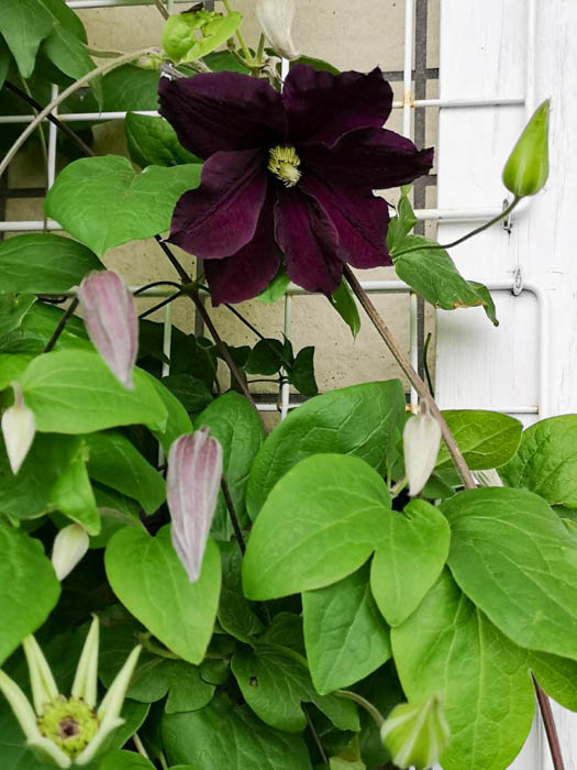 | 形態 | 葉柄が他物に巻きつきながら成長する。葉は奇数羽状複葉で、対生する。小葉は3~5枚で、全縁で先が尖った卵形。花期は初夏〜秋。新枝咲き。中〜大輪のベル形〜平開咲きで、萼片は4~6枚。下向き〜横向き〜上向きに咲く。蕾は下向き〜横向き〜上向き。多花性。花色は、紫、濃紫、薄紫、ピンク、濃ピンク、赤、白、中心に筋が入るものなどで、色彩が濃いものが多い。 |