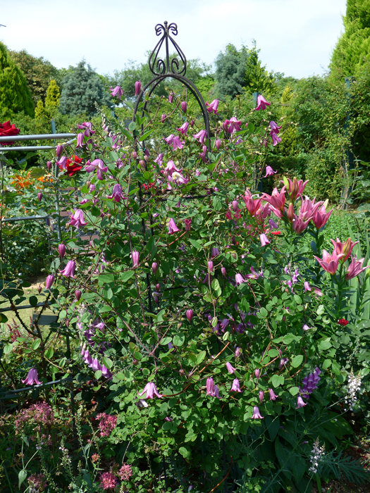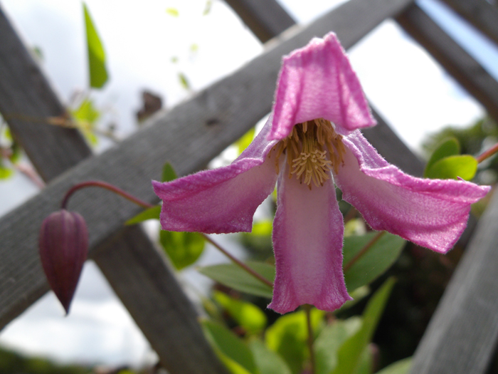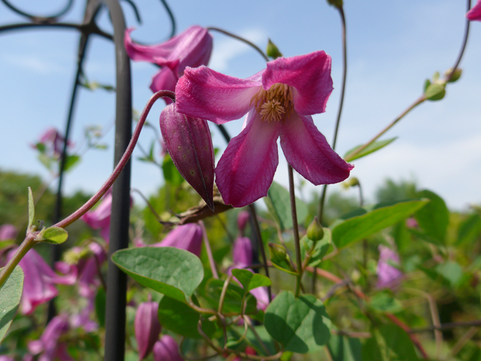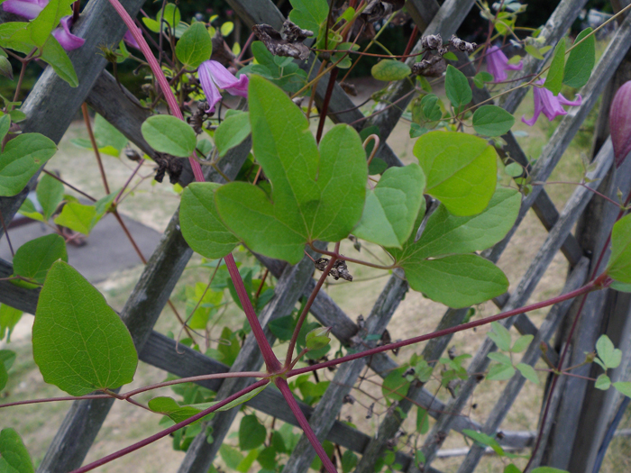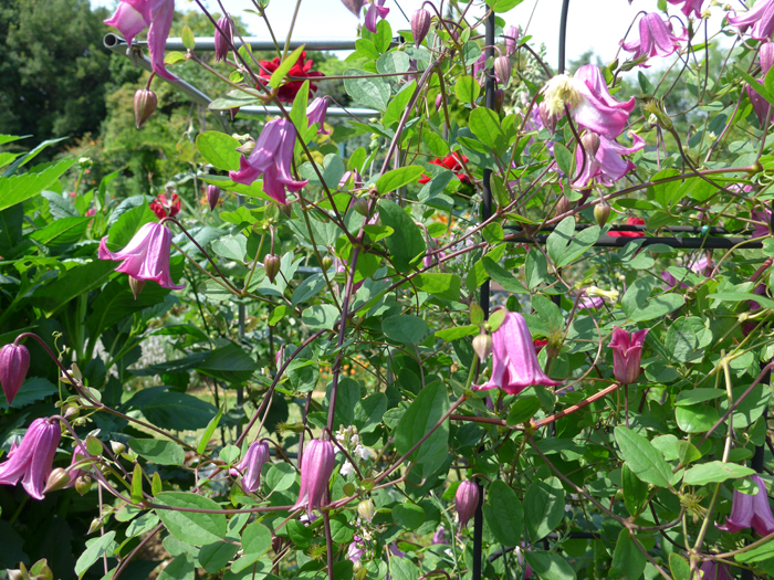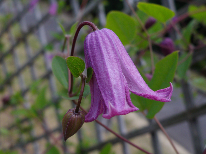 | 形態 | 葉は3出複葉、または羽状複葉。花期は晩春〜初秋。新枝咲き。小〜中輪の壺形やベル形で、萼片は4~6枚。下向き〜横向きに咲く。蕾は下向き〜横向き。花色は、赤、赤紫、紫、薄紫、黒紫、ピンク、白など。 |
