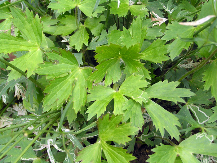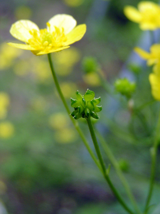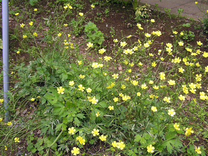 | 形態 | 直立し、上部はよく分枝する。根生葉には長い柄があり、掌状に3~5裂し、縁には不揃いの鋸歯がある。茎や葉柄には白い毛が多い。4~5月に咲く花は光沢のある黄色。金平糖状の果実をつける。 |