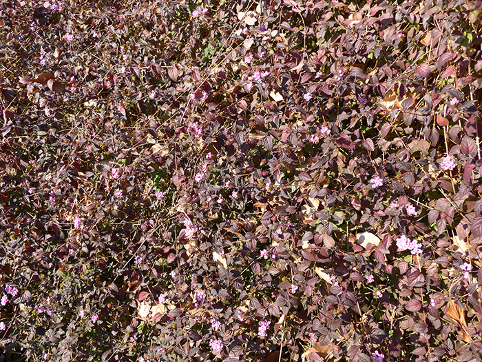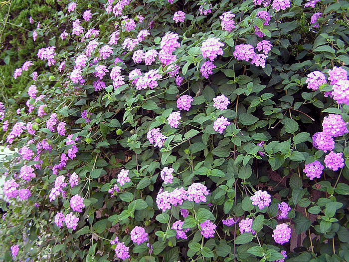 | 形態 | 「ランタナ」よりも小型で、匍匐性。葉はややくすんだ色合い。花色は桃色一色で、色の変化はない。葉茎に芳香がある。 |