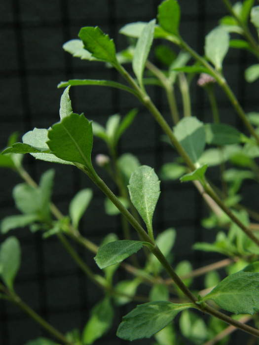 | 形態 | 茎が地表を這って伸び、各節から根を出して分枝しながら繁茂する。葉は楕円形で、先半分に鋸歯があり、対生する。5~9月頃、葉腋から花茎が直立し、枝先に半球形の花序をつける。花は白~淡ピンクで中央部が黄色い。種子はできない(不稔性)。 |