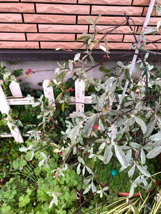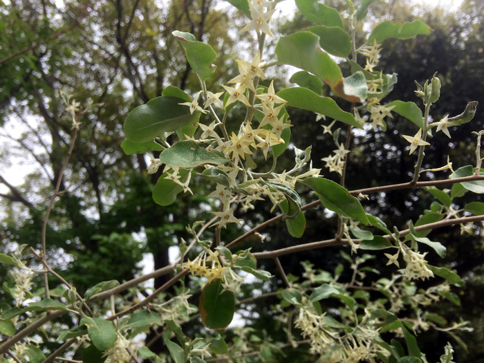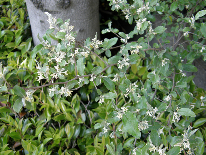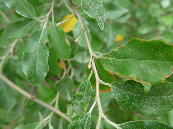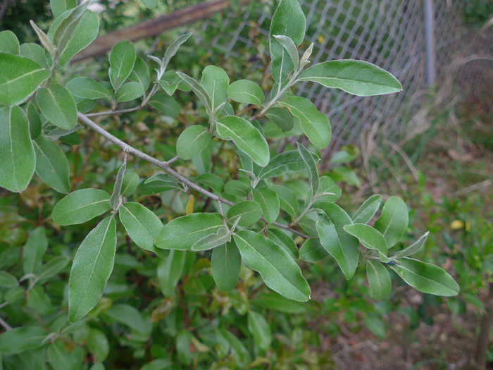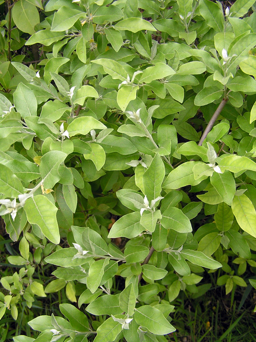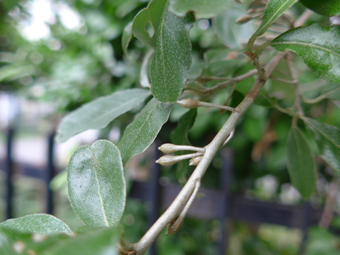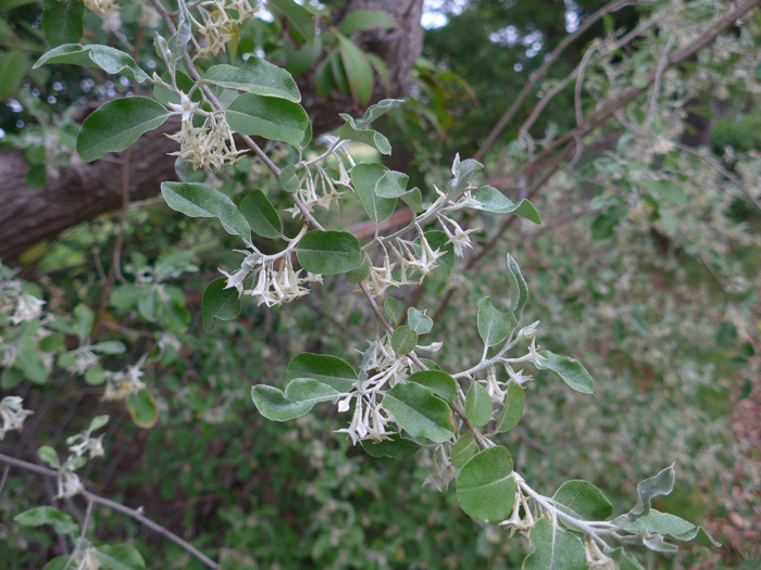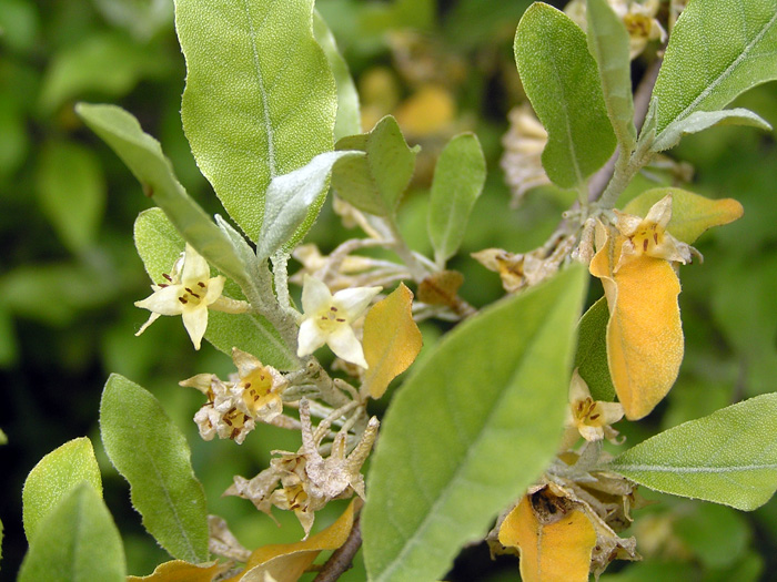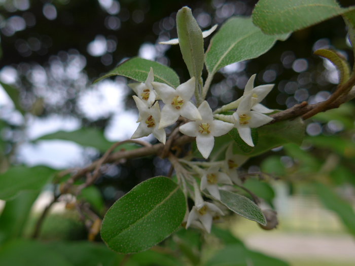 | 形態 | 茎は直立して分岐する。枝には棘があり、小枝は灰白色を帯びる。葉は長楕円形で、互生する。葉には灰白色の鱗片毛があり、特に裏面に密生する。5月頃に、葉腋に数個の花が垂れ下がって咲く。花弁のように見えるのは4裂した萼筒。花色は白色で、次第に黄色がかり、外側には薄茶色の斑点がある。花には香りがある。果実はほぼ球形の偽果で、10~11月頃赤く熟す。 |