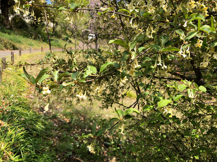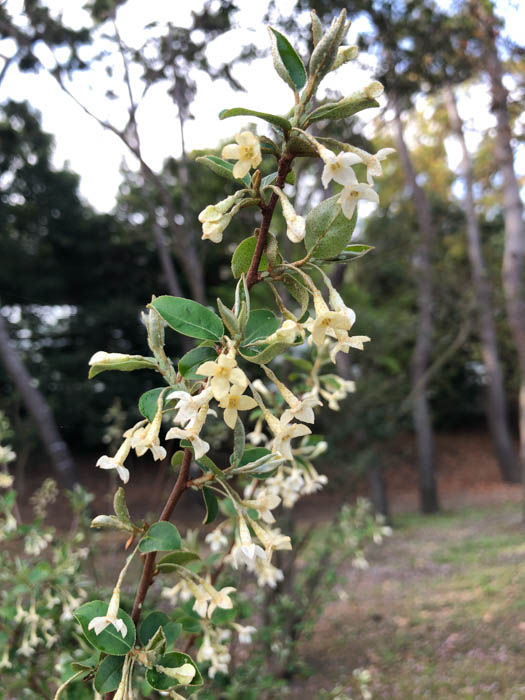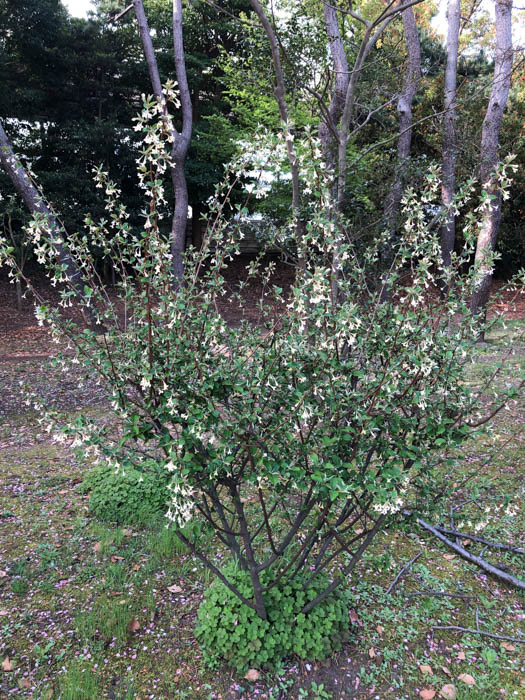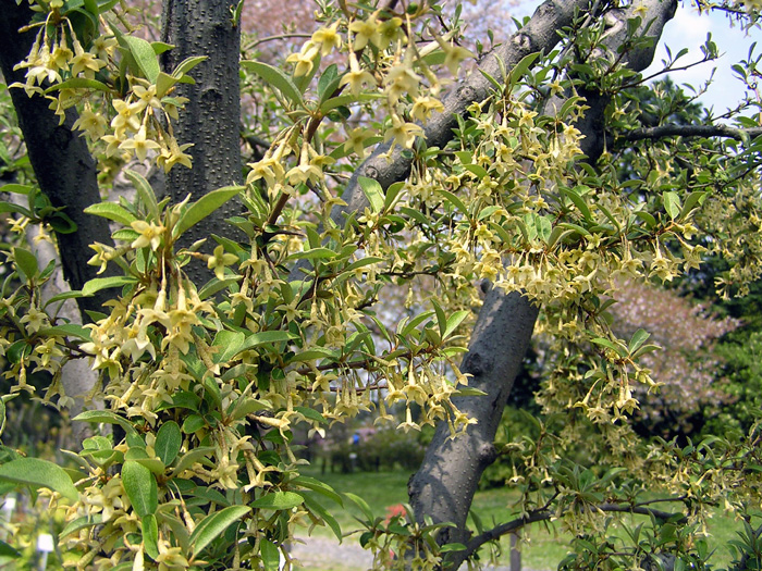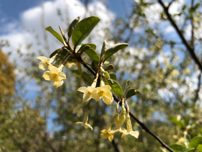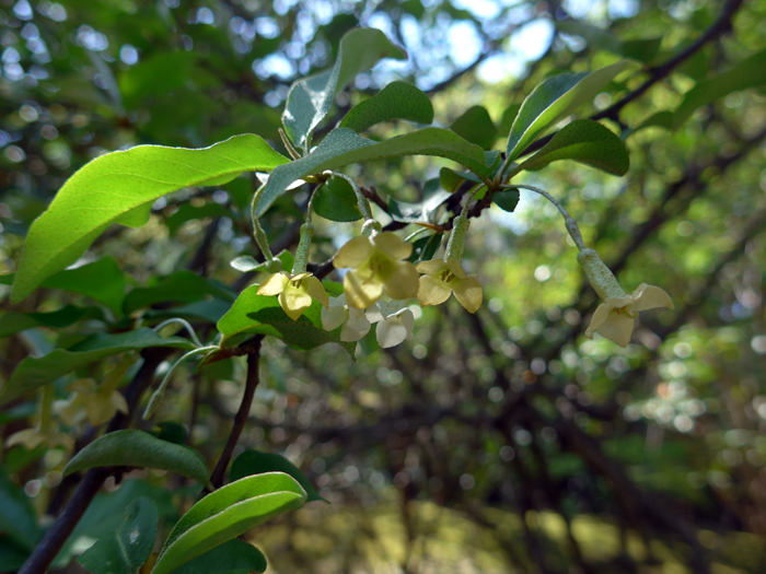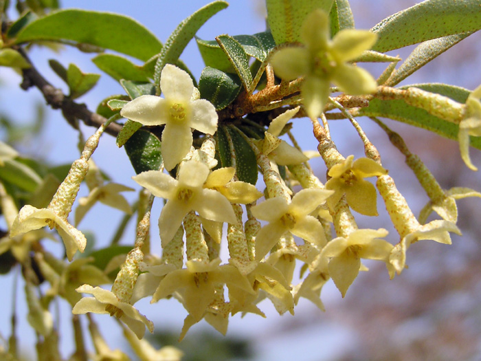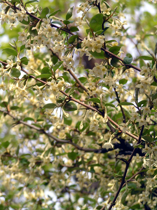 | 形態 | しばしば枝が棘状になる。若枝は褐色の鱗状毛に被われる。葉は長楕円形または倒卵状長楕円形で、互生する。表面には初め灰白色の鱗片毛があるが脱落して緑色になり、裏面には灰白色と褐色の鱗片毛が密生する。4~5月頃に、葉腋に数個の花が垂れ下がって咲く。花弁のように見えるのは4裂した萼筒。花色は白色で、次第に黄色がかり、外側には薄茶色の斑点がある。花には香りがある。果実は楕円形の偽果で、6月頃赤く熟す。 |
