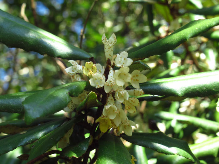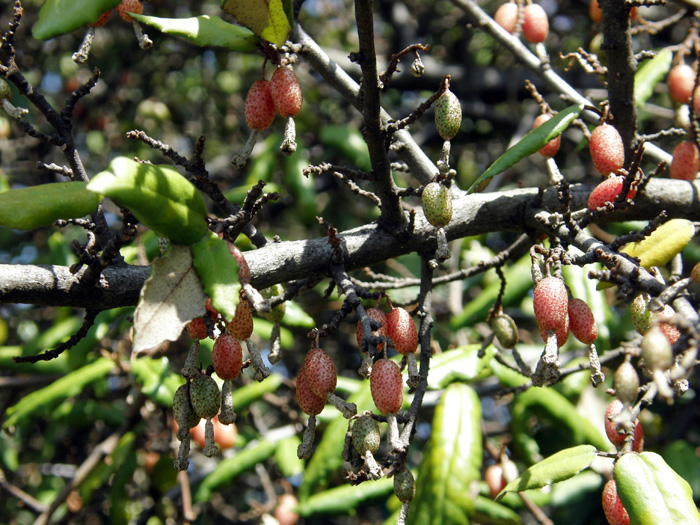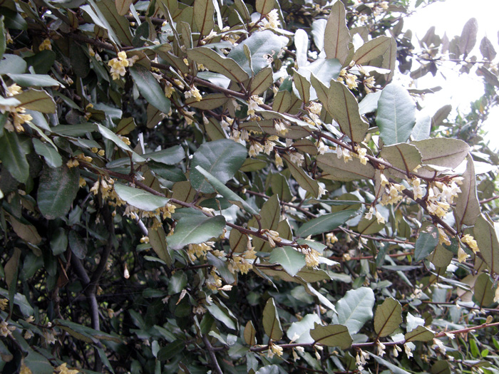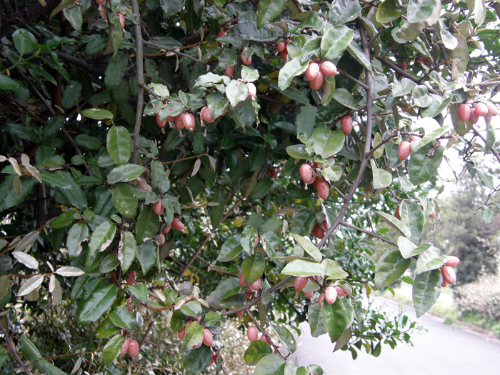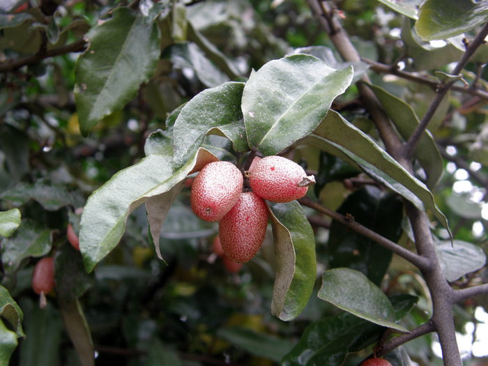 | 形態 | 枝には棘があり、小枝は灰白色を帯びる。葉は硬い皮質の長楕円形で縁が波打ち、互生する。葉の表面は無毛で光沢があり、裏面には灰白色と褐色の鱗片毛が密生する。10月頃に、葉腋に数個の花が垂れ下がって咲く。花弁のように見えるのは4裂した萼筒。花色は白色で、次第に黄色がかり、外側には薄茶色の斑点がある。花には香りがある。果実は楕円形の偽果で、翌年の4~5月頃赤く熟す。果実にも薄茶色の斑点がある。 |