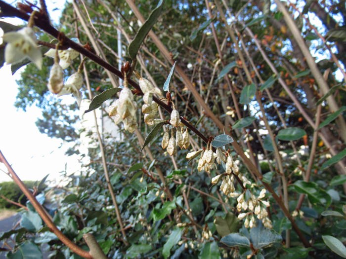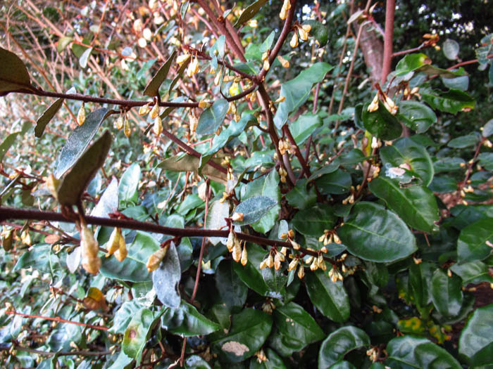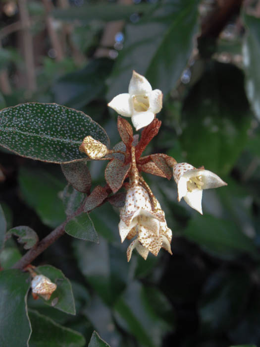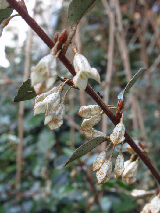 | 形態 | 茎は直立して分岐するが、新枝が蔓状になり枝垂れる。葉は広卵形で先端は尖り、縁は波打つ。葉の表面は深緑色で光沢があり、裏面には灰白色の鱗片毛が密生する。10~11月頃、葉腋に数個の花が垂れ下がって咲く。花弁のように見えるのは4裂した萼筒。花色は白色で、次第に黄色がかり、外側には薄茶色の斑点がある。果実は楕円形の偽果で、翌年の3~4月頃赤く熟す。果実にも薄茶色の斑点がある。 |