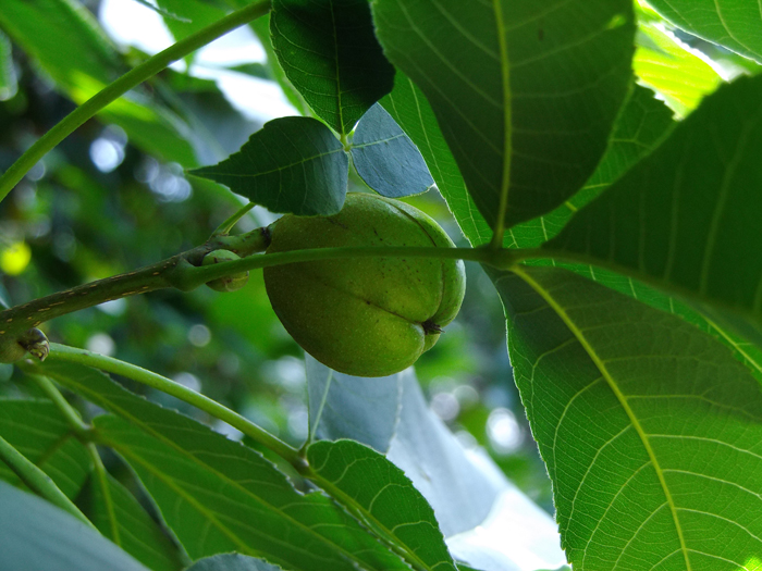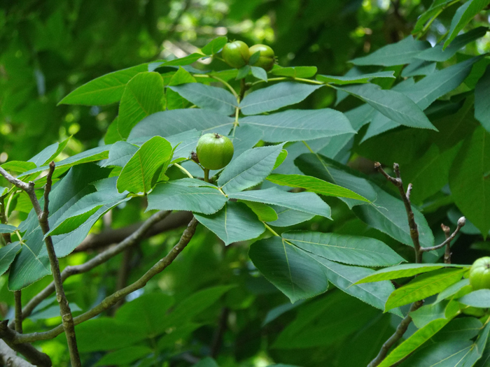| 形態 | 樹皮の色は明灰色で、老木になると樹皮がささくれて剥離する。若枝は細く、軟毛があるが、成長すると無毛になる。葉は小葉3〜7枚からなる奇数羽状複葉で、互生する。小葉は先が尖った楕円形で鋸歯がある。秋には黄葉する。6〜7月頃、枝先にごく小さい雌花が2~5個つき、その下方の葉腋から雄花は尾状花序を下垂させる。果実は花托部分が分厚い乾質の殻状になったほぼ球形の偽果で、9〜10月頃、熟すと殻は4裂し、ほぼ球形の堅果が現れる。 |
