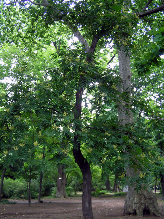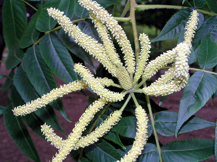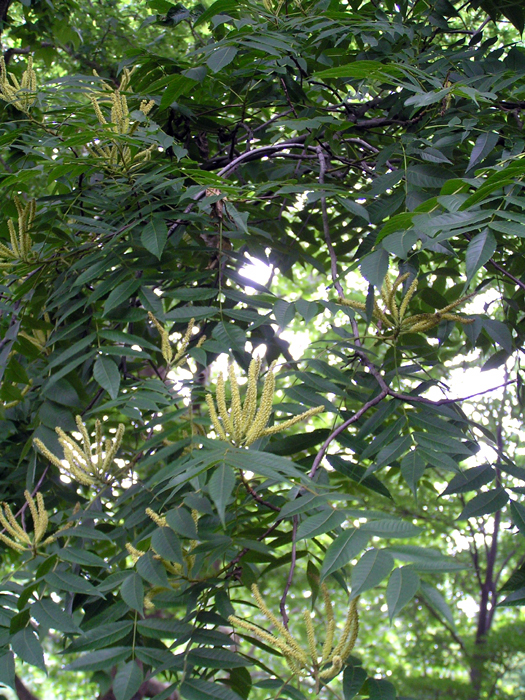 | 形態 | 樹皮は灰色~褐色で、縦に浅く裂ける。葉は、小葉7~15枚からなる奇数羽状複葉で、互生する。小葉は先が細く尖った長楕円形で、細かい鋸歯がある。6~7月頃、本年枝の先に尾状花序を直立させる。先端の1個が雌花序で、雌花序を取り囲んで雄花序がつく。果実は翼のある堅果で、苞が松かさ状になった果穂の中に入る。果穂は新芽が出る頃まで長く枝に残る。 |