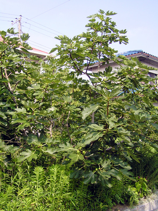 | 形態 | 株元から分枝する。葉は3裂または5裂し、葉の裏には荒い毛が密生し、互生する。葉や茎を切ると乳汁が出る。5~6月頃、倒卵球形の花嚢の内側に隠頭花序をつける。雌雄異株だが日本の栽培品種は雌木。果嚢は夏~秋に濃い紫色に熟す。枝葉を傷つけると白い液が出る。 |