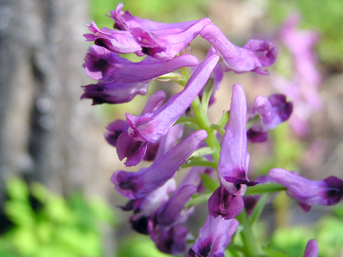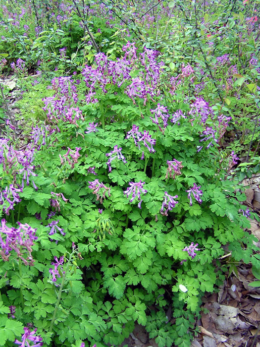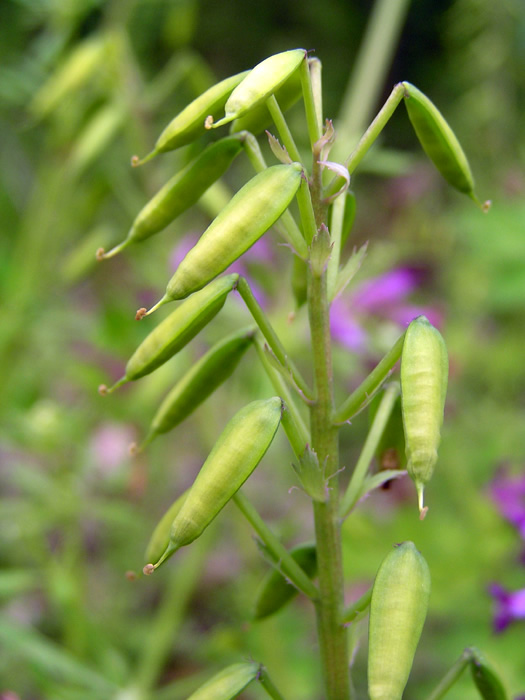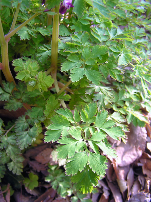 | 形態 | 茎には稜があり、五角形。葉は2~3回羽状複葉で、全体に白緑色。小葉は細かく切れ込む。葉は最初根生し、茎が伸びると茎に互生する。全体が柔らかく、傷つけるとやや悪臭がある。4~6月頃、茎の上部の葉脇から総状花序を出し、紅紫色の筒状の花を多数咲かせる。花は紅紫色、時に白色の唇形で、後ろに距がある。果実は蒴果で垂れ下るようにつき、熟すと2つに裂けて果皮が巻き上がり、種を飛び散らす。 |