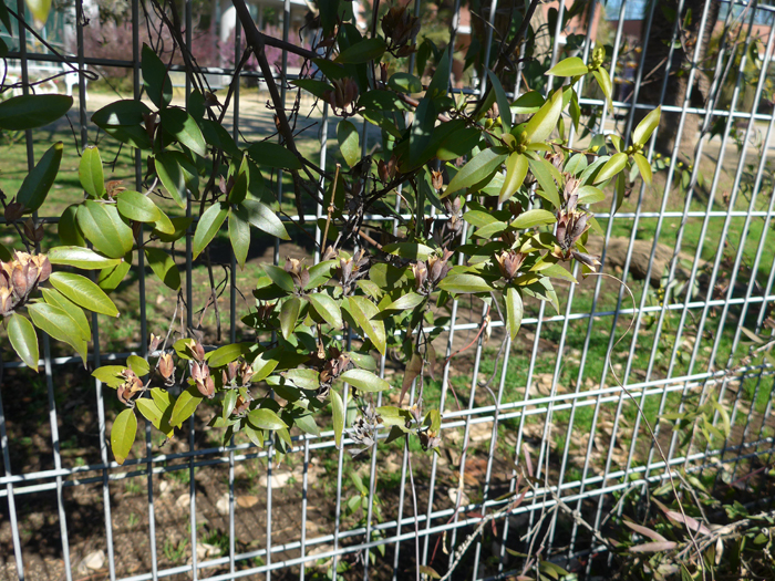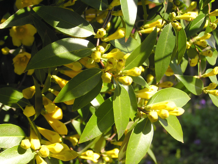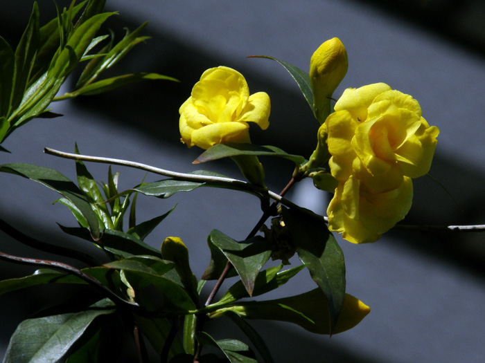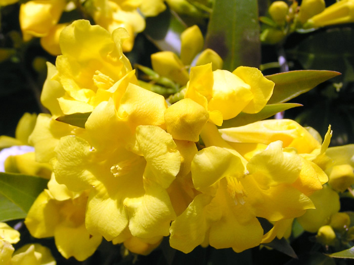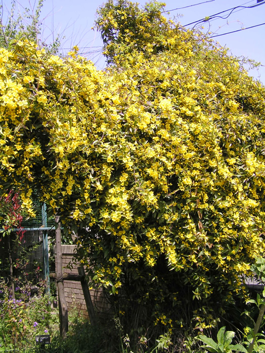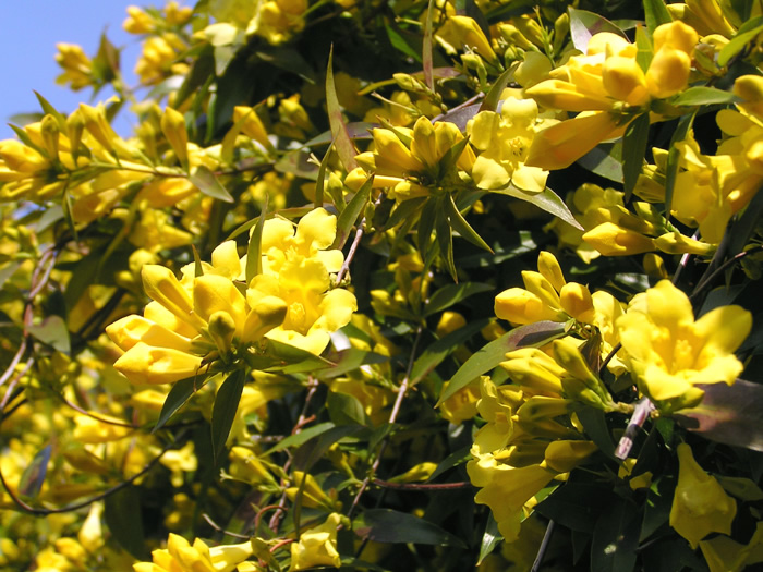 | 名の由来 | 「カロライナジャスミン」は、アメリカのノースカロライナ州やサウスカロライナ州に自生し、花に芳香があるので。「ジャスミン」の名がつくが、「ジャスミン」はモクセイ科。 |
