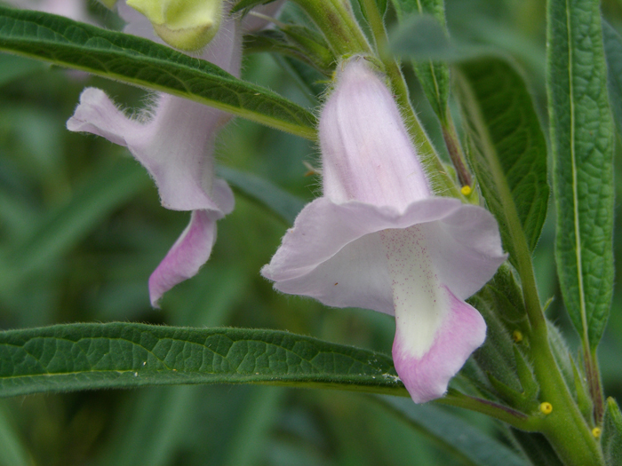 | 形態 | 全体に柔らかい毛が生える。茎は方形で直立し、やや分枝する。下部の葉は、長楕円形や深く切れ込みが入ったりし、不規則な粗い鋸歯があり、葉柄が長く、対生する。上部になると、披針形で、全縁で、葉柄が短く、互生する。7〜8月頃、茎頂に総状花序を作り、下から上へ順に花を咲かせる。花は葉脇に下向きにつき、白〜薄赤紫色の筒状の唇形花で、朝開き夕方には落花する。果実は円柱状の蒴果で、上向きにつく。 |