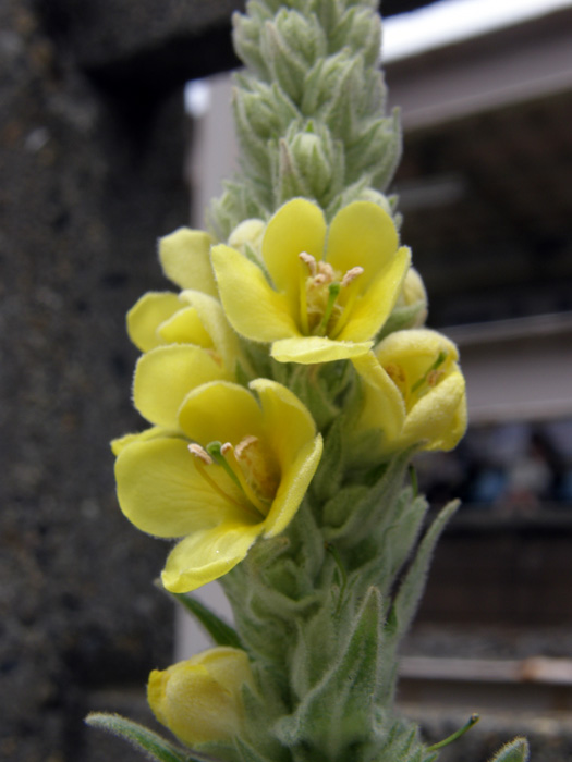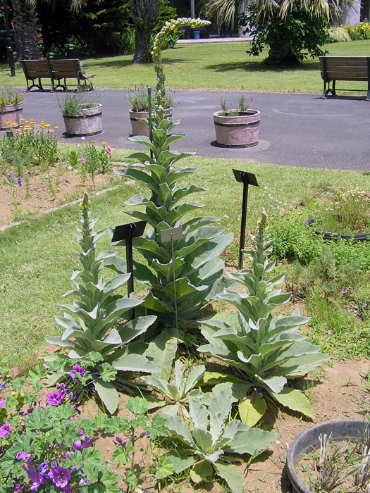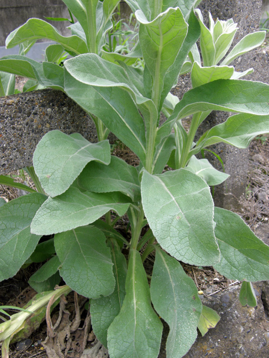 | 形態 | 全体が灰白色のビロード状の毛に被われ、葉色は白緑色になる。根生葉が出て、ロゼット状で越冬する。葉は先が尖った楕円形で、らせん状に互生する。春になると茎が伸び、総状花序を作り、6~8月頃黄色い花を咲かせる。茎は直立し、葉は上にいく程小さいので、全体の草姿は、横から見ると縦長の円錐形になる。花は順序良く咲かないので、花序のあちこちにまばらに咲く。 |