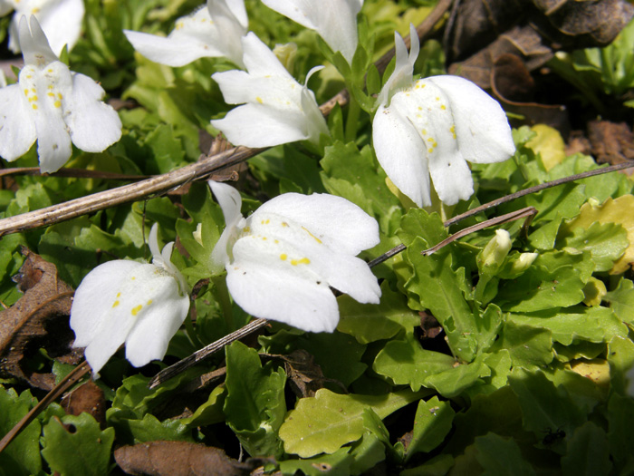 | 形態 | 匍匐枝が地表を這い、発根して増える。根生葉は倒卵形で、粗い鋸歯がある。匍匐枝につく葉は小さく、対生する。4~6月頃、茎を立ち上げ、茎頂に唇形花を数個咲かせる。唇形花の下唇は大きく、先端は3裂し、薄紅紫色で、中央部は白く2列に盛り上がり、黄褐色の斑紋があり、毛が生える。上唇は小さく、先端は2裂して尖る。萼は5裂して先端は尖る。花後できる蒴果は縦に平たい扁球形。 |