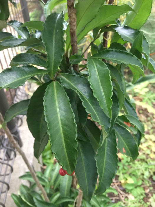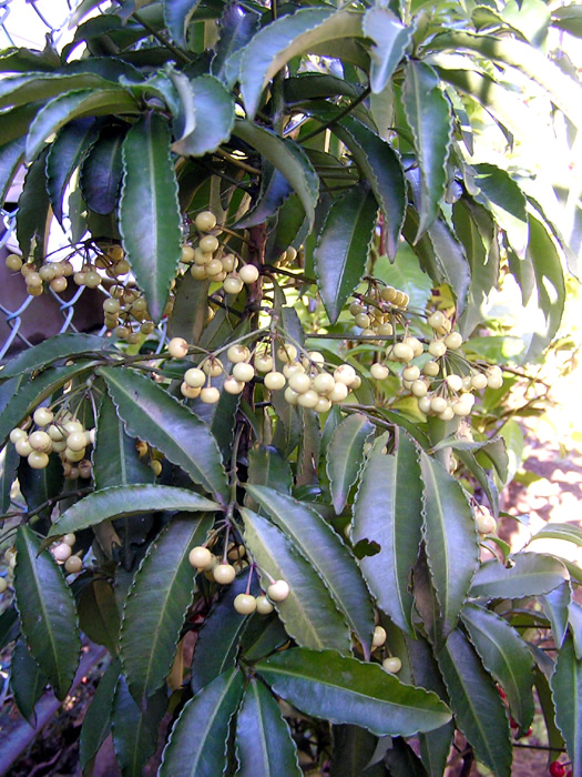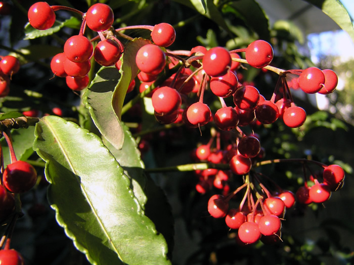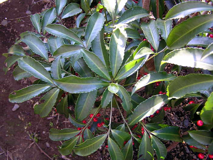 | 形態 | ほとんど枝分かれせずに、まっすぐ主幹を立てる。葉は先が尖った長楕円形で、縁はやや波打ち、丸い鋸歯があり、枝先に集まって互生する。6~7月頃、2年枝の先に散形花序を作る。花冠は白く、5裂し、先端は反り返る。果実は液果状の核果で、1月頃に赤く熟し、1年以上残る。 |