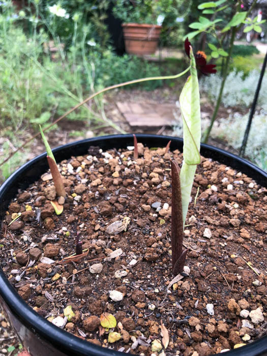 | 形態 | 地下には球茎がある。地面から直接葉柄を伸ばし、叢生する。葉はハート形〜矢尻形で、葉の色は様々で、白や赤の斑や網目模様が入る。地面から直接花柄を伸ばし、白い仏炎苞に包まれた肉穂花序を作る。 |