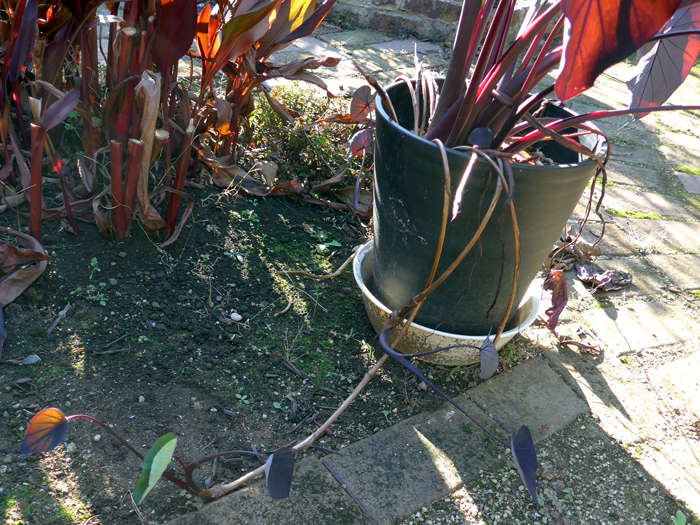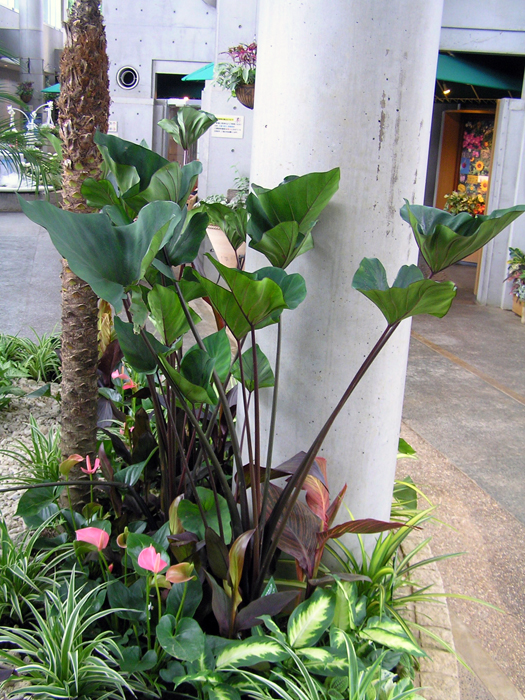 | 特徴 | 鑑賞用の園芸品種。高さは1.8m程度。葉はやや光沢があり、葉柄と葉脈は黒紫色。葉はカップ状にすぼまり、平開しない。 |