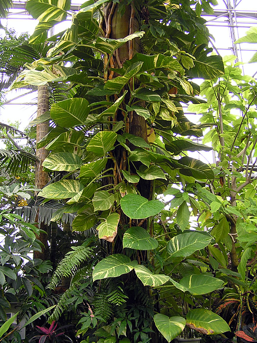 | 形態 | 各節から吸着根を出し、樹木などに着生しながら上に伸びる。葉は光沢がある緑色の革質で、ハート形で長い柄がある。成長すると直径30~40cmの大きな葉になり、深い切り込みが入り、穴があいたりする。観葉で育てるのは幼葉。 |