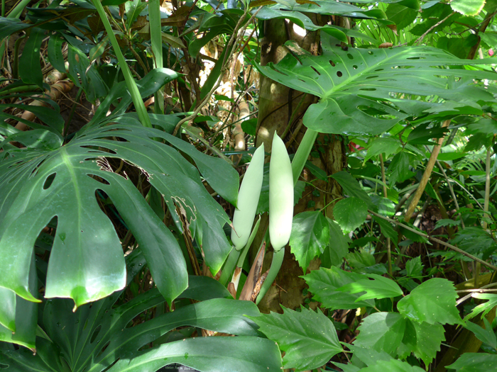 | 形態 | 各節から太くて長い気根を出し、樹木などに着生しながら上に伸びる。葉は光沢がある革質で、ハート形が羽状に切れ込んで、不定型な穴も開き、長い柄がある。葉腋に、白い仏炎苞に包まれた肉穂花序を作る。開花1年後に果実が完熟する。果実は表面は緑色で、果肉は白い。 |