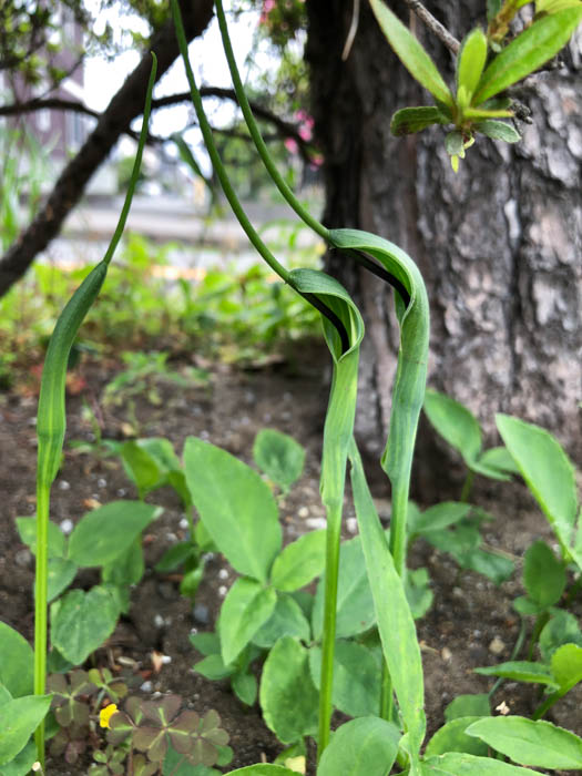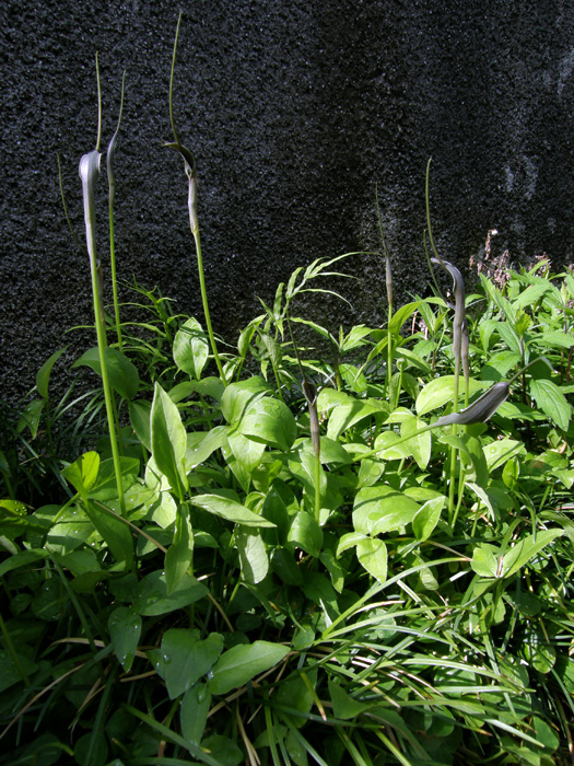 | 形態 | 地下に球茎がある。4~8月頃、地面から直接長い葉柄を持つ葉を出す。葉は3出複葉で、小葉は先の尖った長卵形。葉柄の下部と小葉のつけ根にはむかご(珠芽)ができる。5~8月頃、花茎を葉よりも高く直立させ、緑色~褐色の仏炎苞に包まれた肉穂花序を作る。苞の中の花軸の基部には雌花、その上に雄花が密生し、花軸の先端は紐状になり上向きに長く伸びる。 |