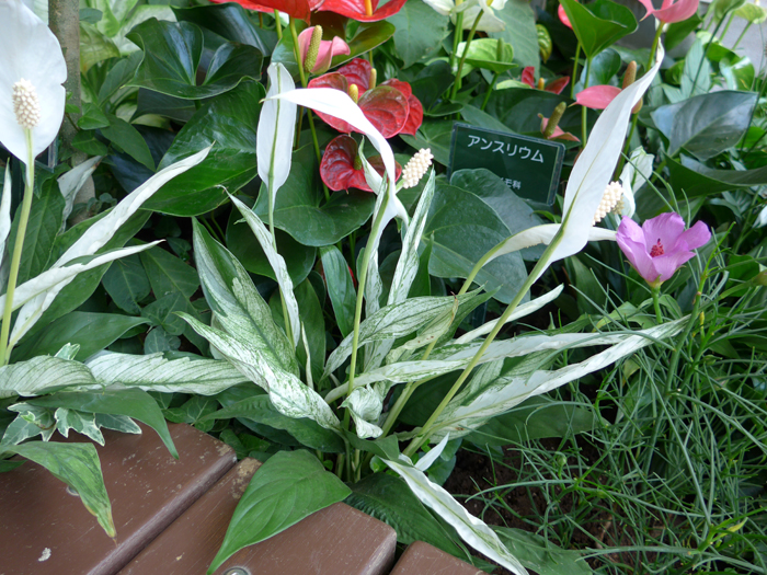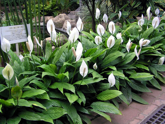 | 生育 | 耐陰性はあるが、日光に当てないと花数が減る。仏炎苞は白から緑に変色するので、色が変わったら切り取る。繁殖は株分け。 |