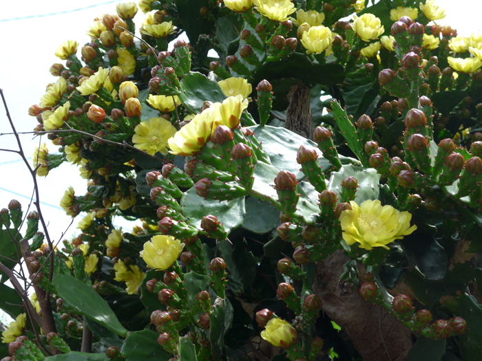 | 形態 | 多肉質で楕円形の板状の茎節が連なって直立し、大きく分枝する。茎節は最初平たい緑色だが、古くなると円筒形の薄茶色になり木質化する。若い茎節には軟らかい鱗片状の葉が螺旋状につく。成長するとこの葉が落ち、脱落箇所から1〜数本の白茶色の棘が出る。6月頃、茎頂に淡黄色の花を咲かせる。果実は臙脂色で倒卵形の液果で、60~180個の種子を含む。 |