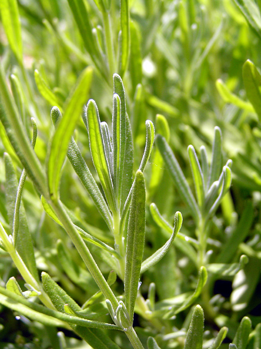 | 形態 | 地際から多数の茎を叢生させ、直立する。葉は灰緑色の線形で、密に対生させる。5~6月頃、茎頂に紫色の小さな唇形花を5~9段に輪生させた穂状花序を作る。全草に香りがある。 |