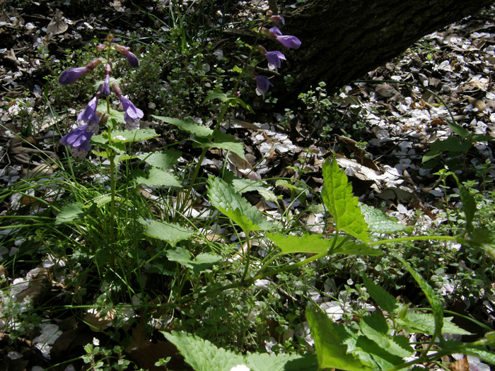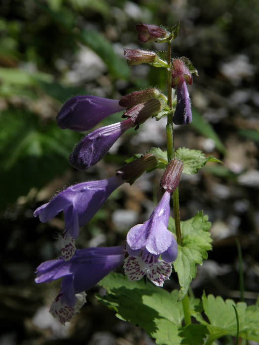 | 形態 | 茎の節から根を出し、匍匐して広がる。茎の先端は立ち上がる。茎は4稜形で全体に毛がある。葉はハート形で鈍い鋸歯があり、対生する。4~6月頃、茎上部の葉腋に数段、紫色の唇形花を一方向に横向きに咲かせる。花は紫色で、下唇の先端部は白く、赤紫色の斑点があり、中央部にヒゲ状の突起がある。筒状の萼は赤味を帯びる。 |