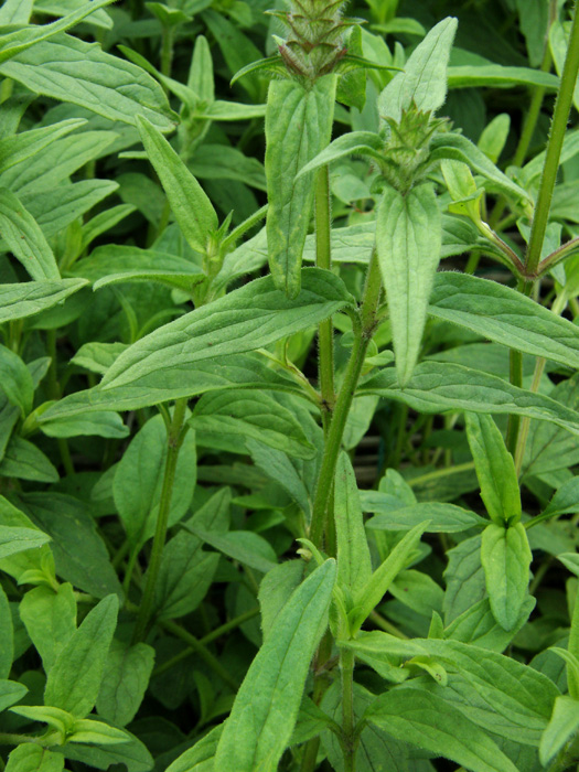 | 形態 | 基部から走出枝が出て広がるので、大きな群落を形成する。全体に白く粗い毛が生える。密生する。茎の断面が四角形。葉は披針形で、全縁またはゆるい鉅歯があり、対生する。6〜7月頃、茎頂に穂状花序を作り、紫色の唇形花を咲かせる。花後、花穂部分は枯れて、褐色になる。 |